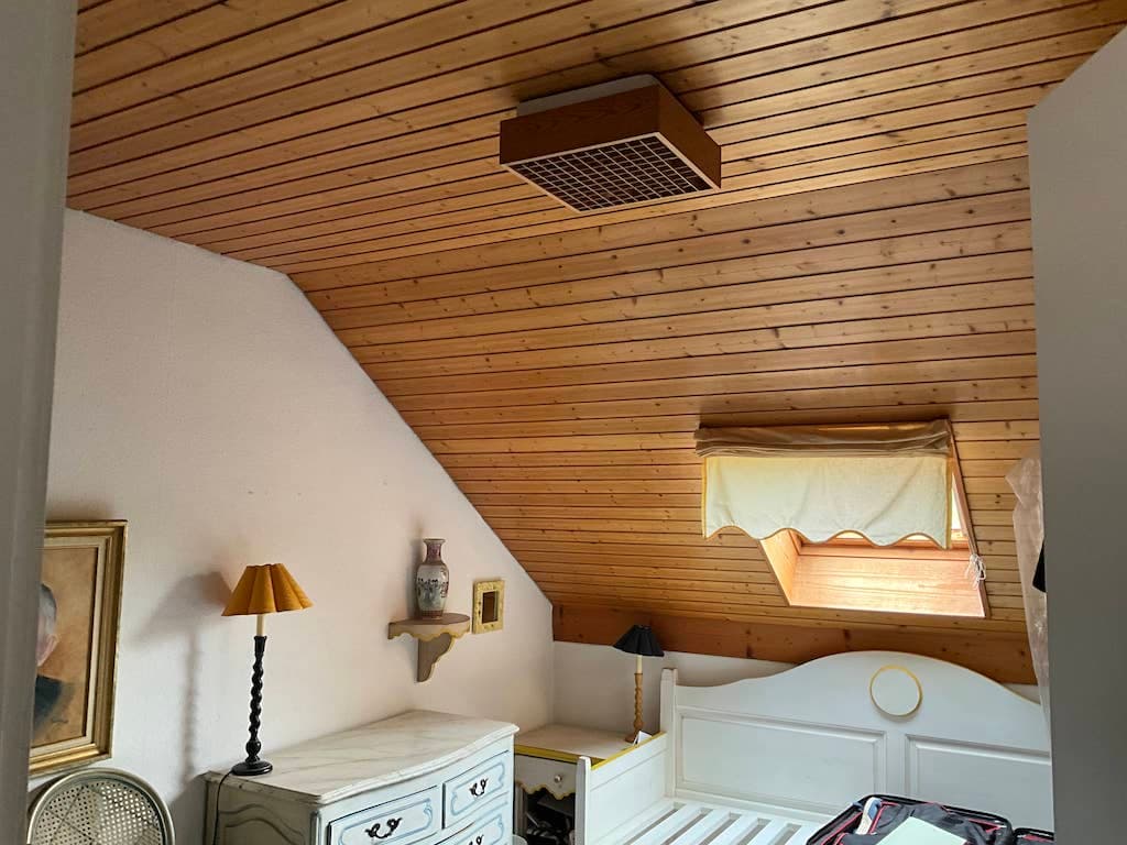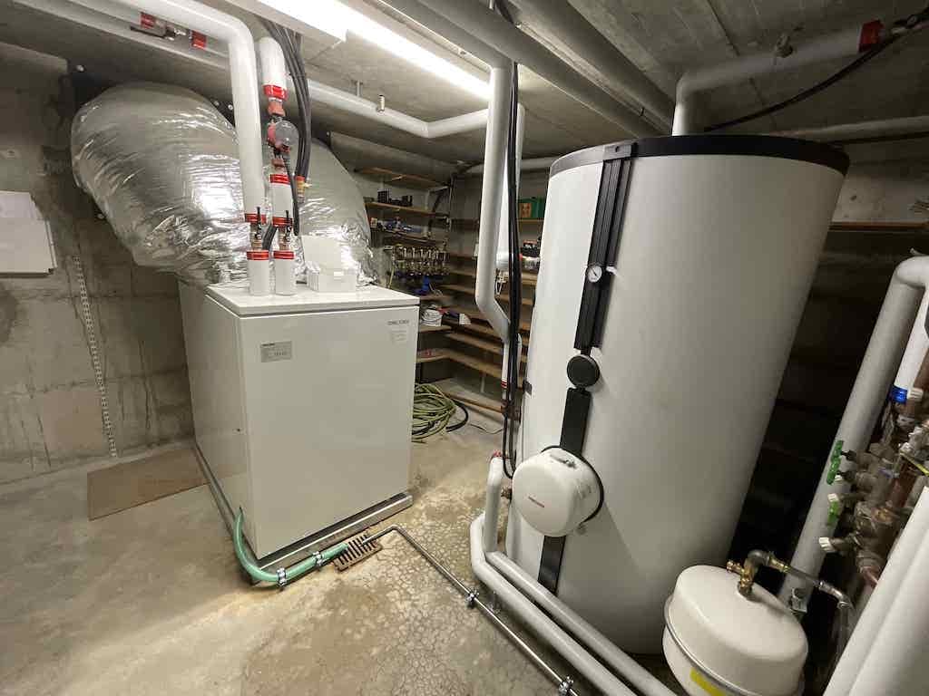 Côté technique, le chauffage au gaz a été remplacé par une pompe à chaleur air/eau. Un chauffage par le sol a été installé, avec équilibrage hydraulique et isolation des conduites, afin d’optimiser le rendement. En toiture, 22 panneaux photovoltaïques d’une puissance totale de 9,75 kWc ont été posés, permettant de produire plus de 11’000 kWh par an. Enfin, deux capteurs solaires thermiques viennent compléter le dispositif pour couvrir près de 40 % des besoins en eau chaude sanitaire.